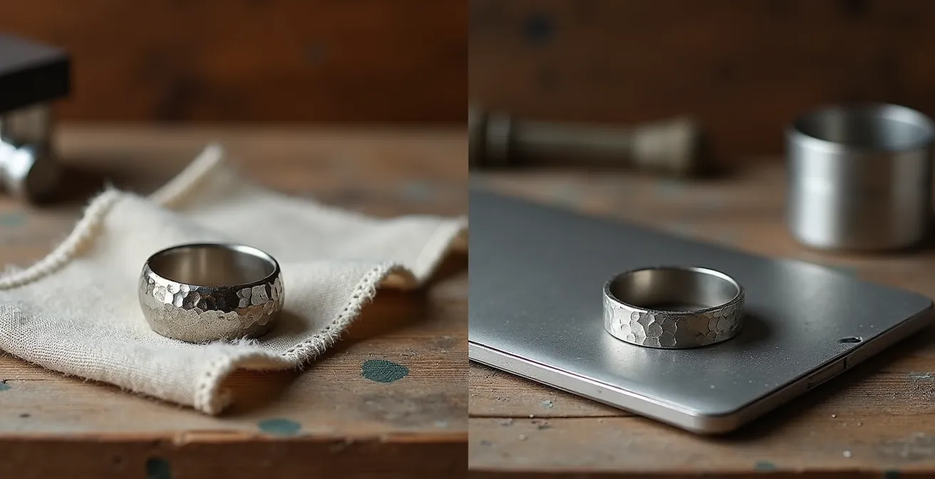 Cette image illustre parfaitement la différence fondamentale entre la texture vivante d’un bijou artisanal et la surface uniforme d’une pièce industrielle.