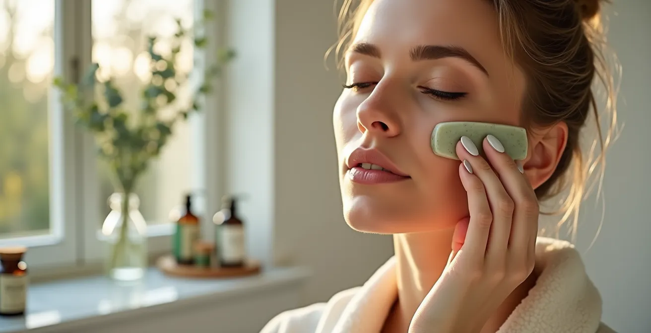 L’automassage du visage est souvent perçu comme un geste purement anti-âge. Pourtant, son impact le plus profond est neurologique. La différence entre un geste machinal et un rituel conscient réside dans l’intention. Que vous utilisiez vos mains ou un outil comme le Gua Sha, l’objectif est le même : ralentir et envoyer un signal de sécurité à votre système nerveux. Le contact lent et les pressions douces sur les muscles faciaux, souvent contractés par le stress, ne se contentent pas de lisser les traits ; ils activent une réponse biochimique apaisante.