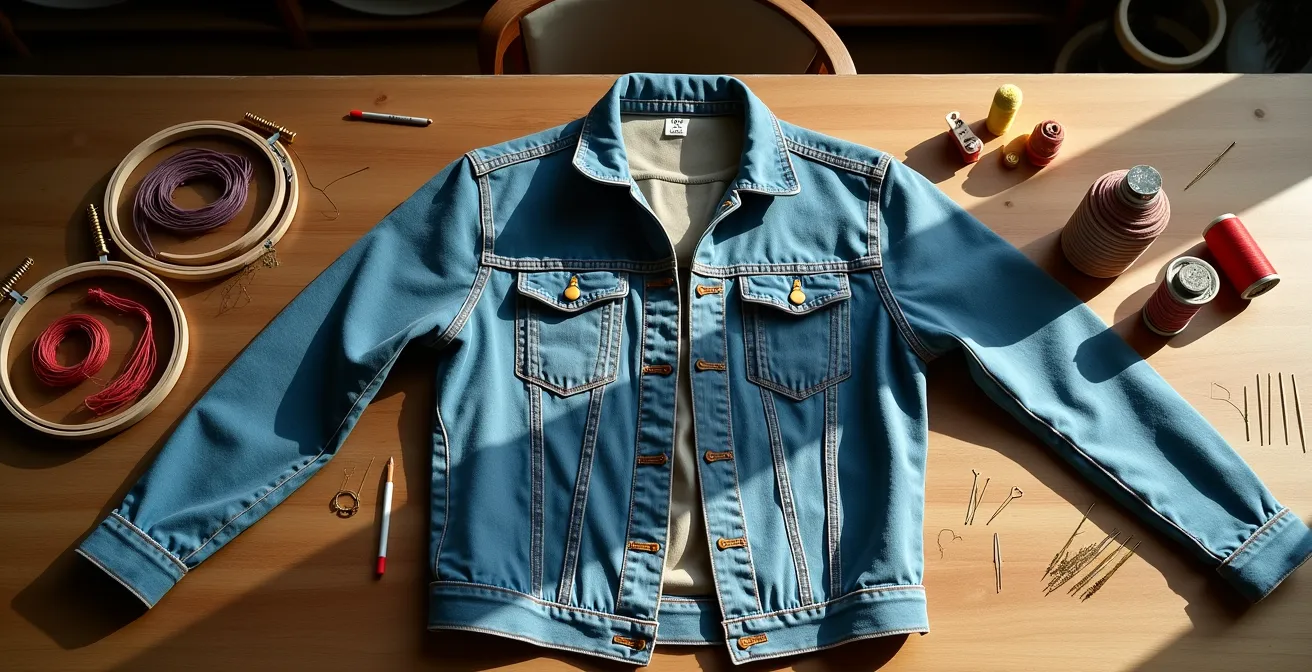 L’upcycling par la broderie moderne n’est pas qu’une simple customisation. C’est un dialogue créatif avec la matière, un acte qui transforme l’usure en beauté et un vêtement standardisé en une pièce de créateur unique. Contrairement aux idées reçues, il ne s’agit pas de viser la perfection, mais d’embrasser l’imperfection pour en faire une force. C’est l’art de la « cicatrice textile », où chaque point de fil devient une partie de l’histoire du vêtement. Oubliez les tutos basiques qui ne font qu’effleurer le sujet. Ici, nous allons plonger au cœur du geste, de la technique et de l’intention.